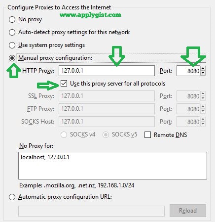 > On configuring Browser, Remember to tick: “Use this proxy server for all protocols” if you want it to open all secured sites.If you don’t know how to configure browser follow the image bellow