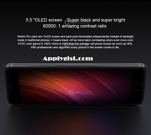 On the front, Redmi Pro utilized new OLED screen and every pixel enlightens autonomously rather than backdrop illumination mode in conventional telephones. Ii implies dark will be more dark differentiating hues significantly more distinctive. NTSC shading array is 100% which is more than the normal phone screen as much as 38%. There are touch ID catch at the base and a movement sensor at the top, and in addition a front camera.