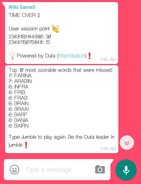 Open the newly created group and simply message “Jumble” and you’ll get your game. You will be given 6 Letters to make any amount of words out of.