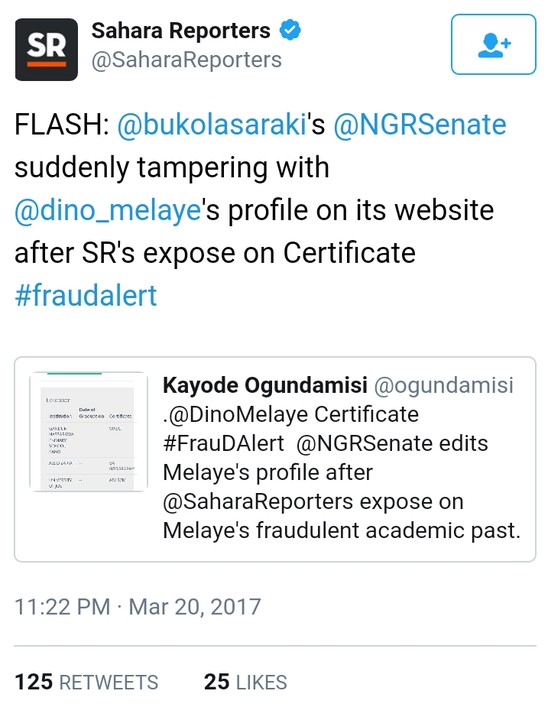 FLASH: @bukolasaraki’s @NGRSenate suddenly tampering with @dino_melaye’s profile on its website after SR’s expose on Certificate #fraudalert