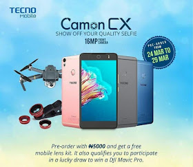 Wow! You can now preorder for Tecno Camon CX also known as Tecno Camon C10 with just 5,000naira only and get amazing rewards. To preorder for Tecno Camon CX, you just have to walk into any Tecno retail outlet with just 5,000naira and get a free mobile lens kit. Not only that, you would also get a raffle ticket that will qualify you to participate in a lucky draw to win a DJI Mavic Pro.