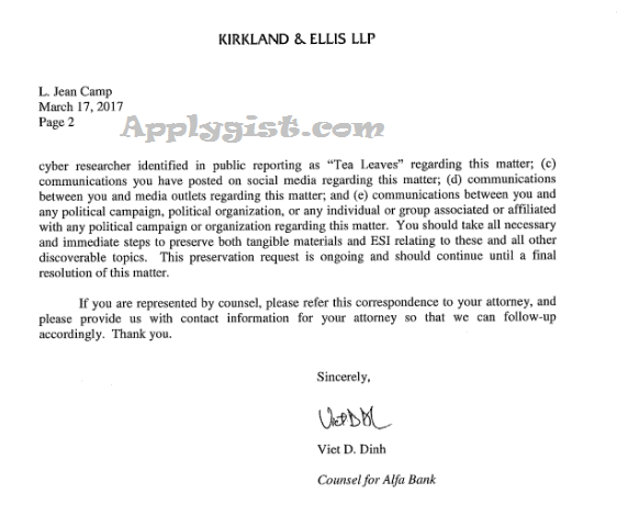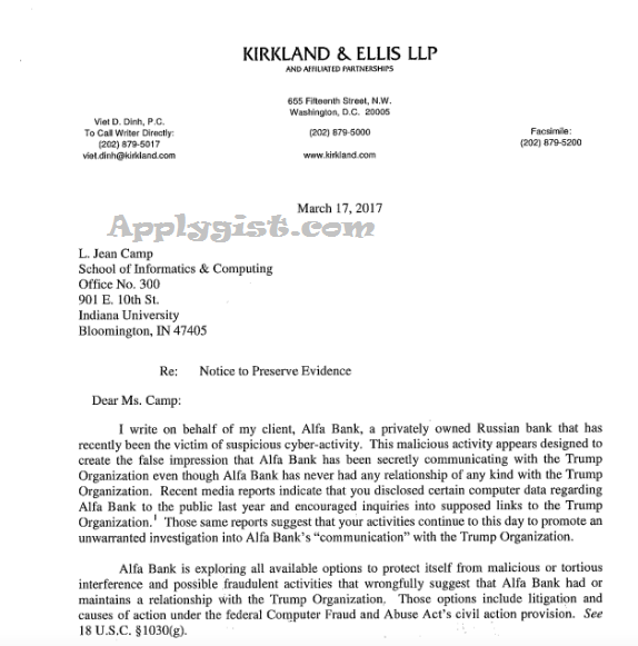 Alfa Bank is considering, among other things, using one of our nation’s most easily-abused laws to pursue legal action against Camp for “promoting an unwarranted investigation” into the bank’s ties to Donald Trump. The CFAA is cited as one route the bank may take towards making Camp pay for besmirching the reputation of the Russian bank. It also demands [PDF] she retain records possibly needed in upcoming litigation, including those detailed in this memorable sentence: