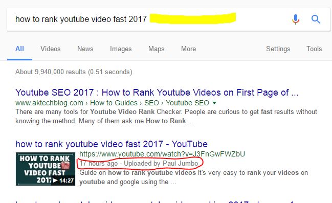 why you need to take this tutorial seriously if you want to rank your video on youtube, I uploaded this video to youtube using the tips below and in less than 24 hours the video is ranking number on google with this keyword “how to rank youtube video fast 2017” the keyword has over 9.9 million google search results.