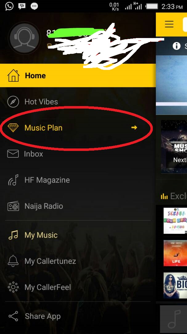 1. Toggle on the three line on the top left side of the MTN MusicPlus App.